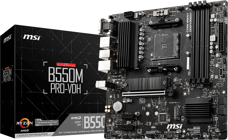 MSI B550M PRO-VDH, AMD, Zócalo AM4, AMD Ryzen 3000 Series, DDR4-SDRAM, 128 GB, DIMM