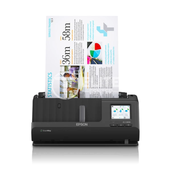 Epson ES-C380W. Tamaño máximo de escaneado: 215,9 x 5588 mm, Resolución óptica de escáner: 600 x 600 DPI, Profundidad de entrada de color: 30 bit. Tipo de escaneado: ADF + escáner alimentado por hojas, Color del producto: Negro, Tipo de control: Botones. Tipo de sensor: CIS, Ciclo de trabajo diario (max): 3500 páginas, Fuentes de luz: ReadyScan LED. Capacidad de entrada estándar: 20 hojas. Tamaño máximo de papel ISO A-series: A4, Tipos de media soportados de escaneo: Tarjeta de visita, Tarjeta de plástico, Post Card(JPN), ISO tamaño de serie A (A0…A9): A4, A5, A6