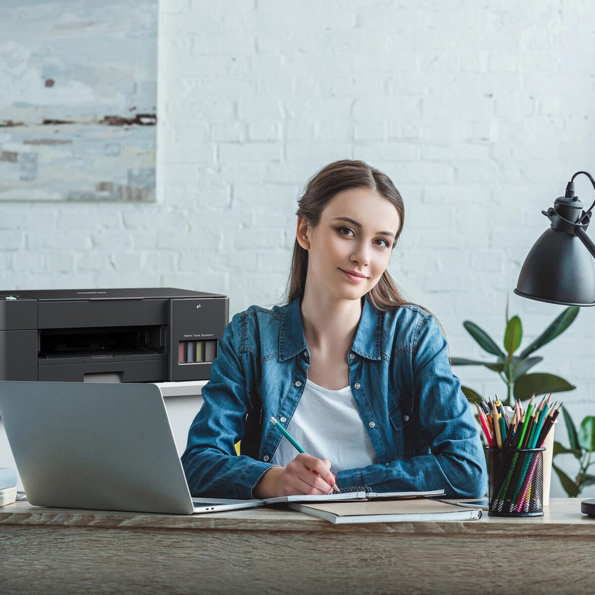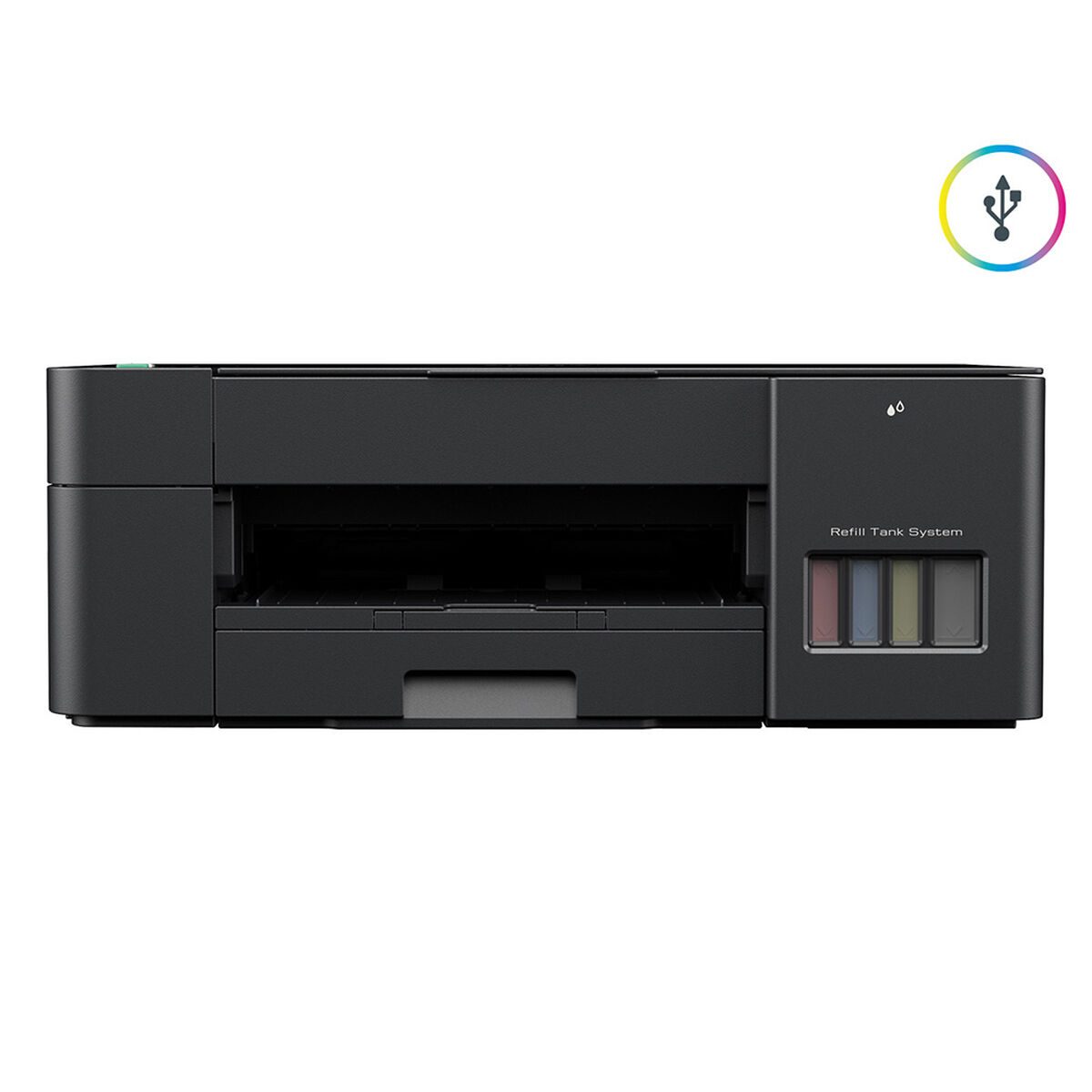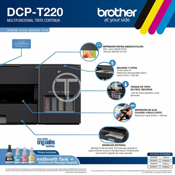 La impresora multifuncional de inyección de tinta a color DCP-T220 de la serie InkBenefit Tank es ideal para el hogar y la oficina en el hogar. Copia y escanea una variedad de documentos e imprime rápidamente a velocidades de hasta 28 ppm en negro y 11 ppm a color (MODO ECO) y hasta 16 ipm en negro y 9 ipm a color (ISO/IEC 24734)‡. Alta calidad de impresión para documentos y fotos en una resolución de hasta 6.000 x 1.200 dpi‡. Bandeja de hasta 150 hojas que ayuda a ahorrar espacio y a proteger el papel de arrugas, y ranura manual para imprimir en distintos tipos y tamaños de papel. El tanque de tinta de recarga frontal permite ubicar a la DCP-T220 prácticamente en cualquier espacio de oficina y viene con un cable USB para conectar el equipo a una PC. Incluye botellas de tinta de hasta 7.500 páginas en negro y 5.000 páginas a color‡.